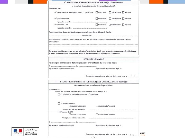 LES ÉTAPES D’ORIENTATION EN 3ÈME ■ De janvier à février, les élèves et leur famille formulent leurs vœux provisoires sur la fiche de dialogue : ■ Seconde générale et technologique ; ■ Seconde professionnelle (sous statut scolaire ou en apprentissage) ; ■ 1ère année de CAP (sous statut scolaire ou en apprentissage). ■ Au conseil de classe du 2 e trimestre, un avis provisoire d’orientation est donné ; il est transmis sur la fiche de dialogue. ■ D’avril à mai, les élèves et leur famille inscrivent leurs vœux définitifs sur la fiche de dialogue. ■ Au conseil de classe du 3 e trimestre, une proposition d’orientation est faite par l’équipe pédagogique : ■ Elle est validée si elle correspond au vœu de l’élève ; ■ Un entretien est organisé entre la famille et le chef d’établissement si elle diffère du vœu de l’élève. ■ De juin à début juillet, les élèves reçoivent leur notification d’affectation et s’inscrivent dans leur futur établissement. 3