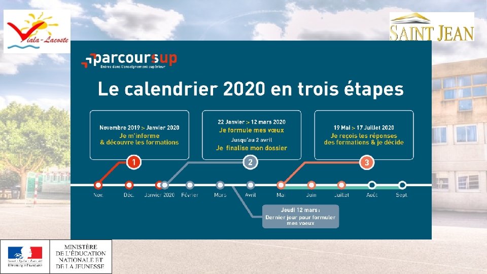 Sommaire • Les objectifs et le calendrier 2020 • Les principes clés de Parcoursup • L’accompagnement pour l’élaboration du projet d’orientation • Etape 1 – 20 décembre > 22 janvier 2020: découverte des formations • Etape 2 – 22 janvier > 2 avril 2020 : inscription, formulation des vœux et finalisation du dossier sur Parcoursup • Etape 3 – 19 mai > 17 juillet 2020: phase d’admission