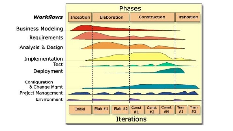 Phases of RUP • RUP is broken into four phases of development, each of which is organized into a number of separate iterations that must satisfy defined criteria before the next phase is undertaken. 1. Inception 2. Elaboration 3. Construction 4. Transition