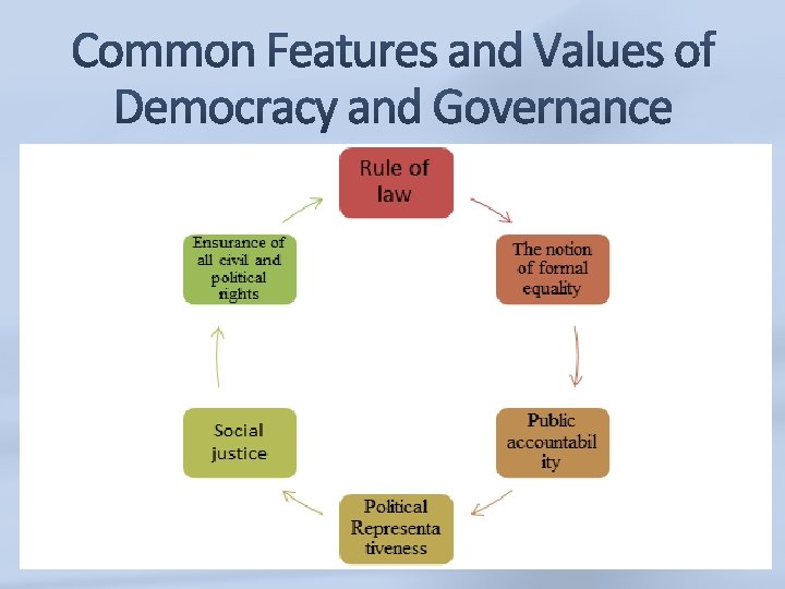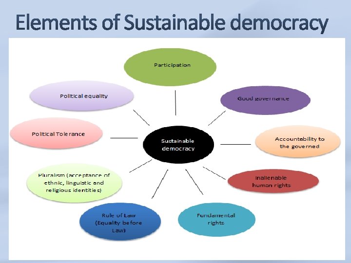 Key relationship: Citizens → Government Key principle: popular control as political equals Spheres: regime rules, officeholders, public policy Tools: technology, institutional capacity, impartial institutions, elections, rights and freedoms, rule of law, development Sustainable democracy- not merely based on electoral procedures or political stability. Key Principles: political power resides in the common people- Equality in the political process, assurance of government for equitable justice, guarantee domestic tranquility, general prosperity, provision of the required security and liberty of the common person. Tools - reliable structures, strong institutions and balanced stated powers, which can lead to the national development