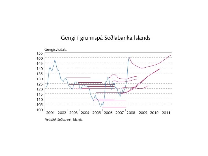 Horfið frá fastgengisstefnu 100 31. desember 1991 = 100 105 110 Verðbólgumarkmið/flotgengi 27. mars 2001 115 120 125 130 135 Gengisvísitala Vikmörk gengisstefnu ( 140 145 150 155 2000 Source: Central Bank of Iceland. | 2001 | 2002