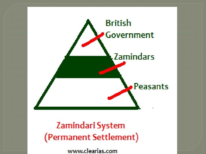 Permanent Settlement � Zamindari System was introduced by Cornwallis in 1793 through Permanent Settlement Act. � It was introduced in provinces of Bengal, Bihar, Orissa and Varanasi. � Also known as Permanent Settlement System. � Zamindars were recognized as owner of the lands. Zamindars were given the rights to collect the rent from the peasants. � The realized amount would be divided into 11 parts. 1/11 of the share belongs to Zamindars and 10/11 of the share belongs to East India Company.