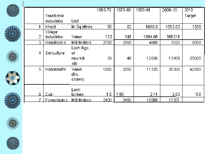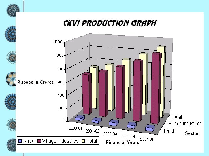 CURRENT STATUS PRODUCTION (Rs. In Crores) Year Khadi Village Industries Total 2000 -2001 431. 57 6491. 69 6923. 26 2001 -2002 411. 00 7140. 52 7551. 52 2002 -2003 443. 07 8126. 30 8569. 37 2003 -2004 453. 50 9228. 27 9681. 77 2004 -2005 461. 54 10458. 89 10920. 43 Source: Website of Khadi & Village Industries Commission