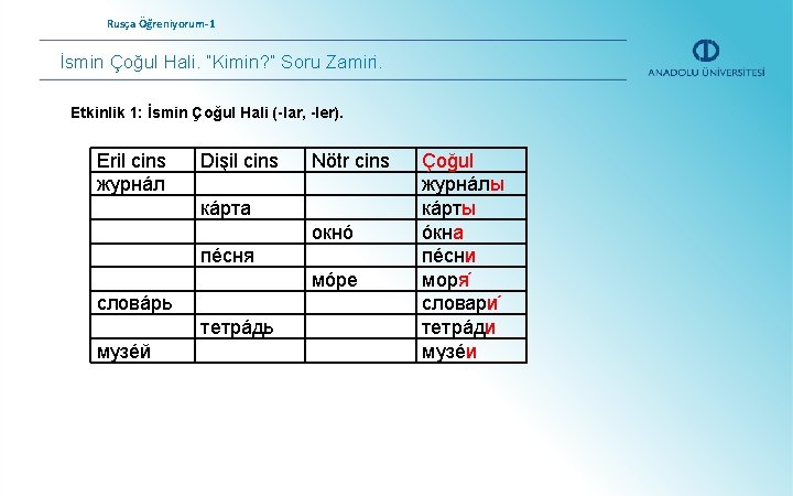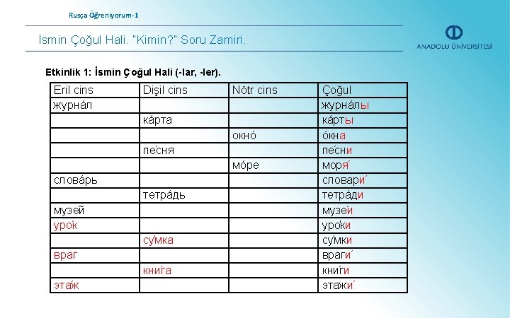 Rusça Öğreniyorum-1 İsmin Çoğul Hali. “Kimin? ” Soru Zamiri. Etkinlik 1: İsmin Çoğul Hali (-lar, -ler). К ↘ Г → + И Х↗ Ш ↘ Ж↘ + И Ч ↗ Щ ↗ «к, г, х» ve «ш, ж, ч, щ» harflerinden sonra asla «ı» harfi gelmez kuralı sadece isimlerin çoğul haline özgü bir durum değildir. Rusçada söz konusu olan bu 7 harften sonra «ı» harfi asla kullanılmaz.