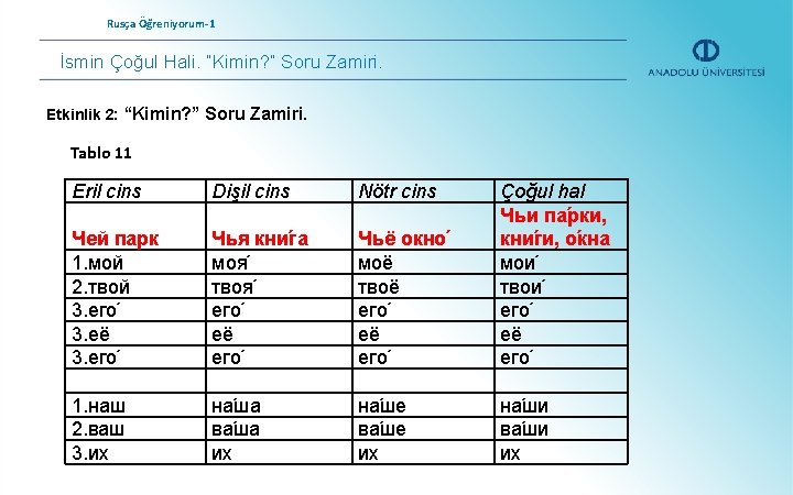 Rusça Öğreniyorum-1 İsmin Çoğul Hali. “Kimin? ” Soru Zamiri. Etkinlik 2: “Kimin? ” Soru Zamiri. Bu etkinlikte Sahiplik zamirlerine sorulan “Kimin? ” sorusunu işleyeceğiz. Önceki haftalarda Sahiplik zamirlerinin ismin cinsine uyum sağladığının örneklerini görmüştük. Bu hafta Sahiplik zamirine sorulan “Kimin? ” sorusunu tanıyacağız ve örnekleriyle birlikte işleyeceğiz. “Kimin? ” чей [çey], чья [çya], чьё [çyo], чьи [çyi]