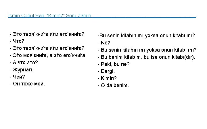 Rusça Öğreniyorum-1 İsmin Çoğul Hali. “Kimin? ” Soru Zamiri. - Чей брат до ктор? Твой и ли его ? - Его брат. А мой (брат) инжене р. - Kimin kardeşi doktor? Senin mi yoksa onun mu? - Onun kardeşi. Benim kardeşim ise mühendis. - Чей брат до ктор? Твой и ли его ? - Его брат не до ктор. Мой (брат) то же (не до ктор). - Kimin kardeşi doktor? Senin mi yoksa onun mu? - Onun kardeşi doktor değil. Benim (kardeşim) de (doktor) değil. Dikkat ederseniz ki bu zamana kadar gördüğümüz bütün soru cümlelerinde soru kelimesi cümlenin başında yer almaktadır.