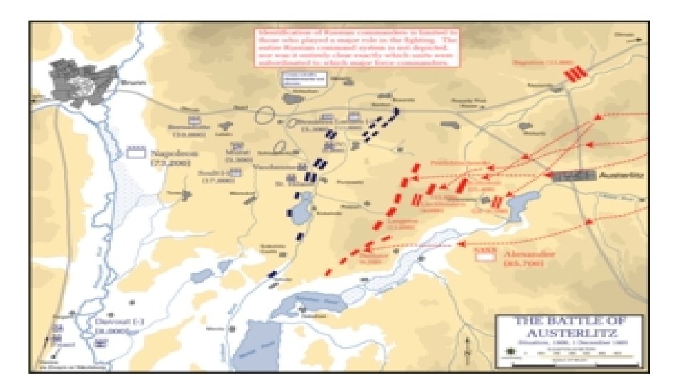 Bitva u Slavkova • známá též jako bitva tří císařů, se odehrála 2. prosince. 1805 zhruba mezi vesnicemi Telnice a Tvarožná nedaleko Slavkova u Brna. • Francouzská armáda v čele s císařem Napoleonem zde drtivě porazila vojsko III. koalice, kterou zastupovali vojáci Ruského impéria v čele s carem Alexandrem I. a generálem M. I. Kutuzovem a oddíly Rakouského císařství pod vrchním velením císaře Františka I. • Střetnutí u Slavkova je jednou z nejznámějších bitev, které proběhly na území Moravy, a spolu s bitvou u Gaugamél, bitvou u Kann a bitvou u Leuthenu patří mezi mistrovská díla taktiky. [4] • Napoleonovo vítězství nejenže rozbilo svazek III. koalice, ale mělo také vliv na uspořádání státních celků v celé tehdejší střední Evropě, zejména pak v římskoněmecké říši. • Přestože francouzský císař řídil úvodní fáze bitvy z návrší Žuráň (286 m n. m. , dnes v katastru obce Podolí v okrese Brno-venkov) a František I. s carem Alexandrem měli svůj hlavní stan zřízený v Křenovicích, nazval francouzský císař bitvu podle Slavkova, vzdáleného od centra bojiště zhruba 9 km.