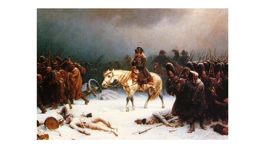 Napoleonova porážka • Kutuzov se rozhodl ustoupit a zanechat Moskvu • Napoleon vstupuje do prázdné Moskvy – nejsou zde obyvatelé ani zásoby → rabování, požáry • Napoleon marně čeká na klíče od města a kapitulaci Rusů • Začíná zima a Napoleon se rozhodne k návratu, je nucen postupovat po již vypáleném a vydrancovaném území zpět • Poslední porážku utrpí u řeky Bereziny • Z téměř půl milionové armády se zachrání pouze 10 - 20 000 francouzských vojáků