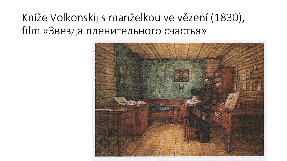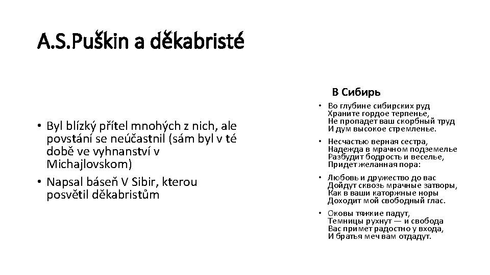 Povstání děkabristů • Po návratu z Evropy, kde se seznámili s ideály francouzské revoluce i poměry, které byly mnohem příznivější než v Rusku, mladí důstojníci začali zakládat tajné politické spolky → nejvýznamnější byly Severní a Jižní spolek • Jejich požadavky byly především větší politická svoboda, zrušení nevolnictví a konstituční monarchie, nejradikálnější žádali republiku