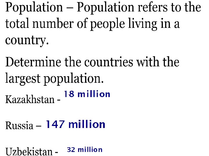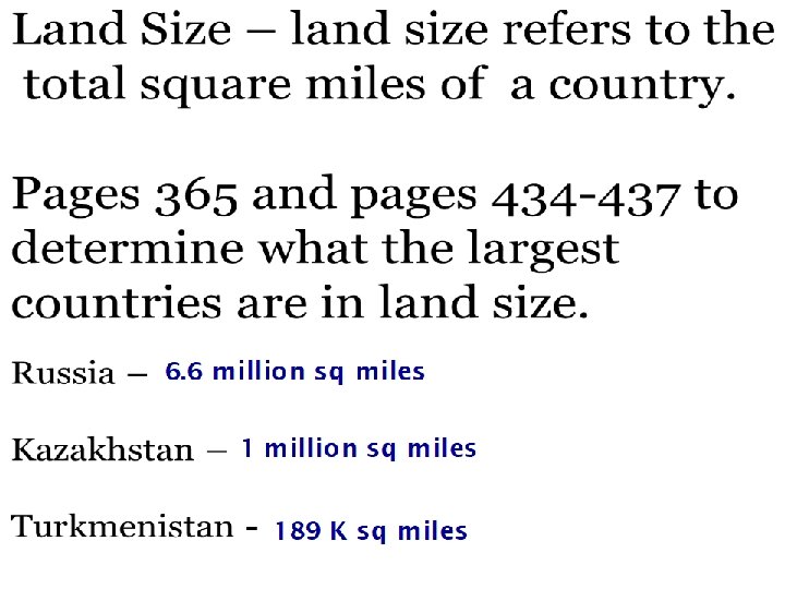 Land Size in asia • Russia covers 2 continents - Europe and Asia • 25% of Russia is located in Europe and 80% of it’s population live there This area is named “Russian Federation” and shortened to “Russia” • Russia spans 11 time zones!