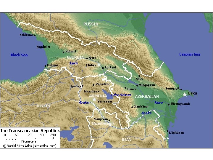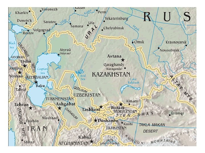 Southern landforms • Caucasus and Other Mtns – Caucasus » btw Black and Caspian Seas » form border btw Russia and Transcaucasia Trans= Armenia, Azerbaijan, Georgia – Further east » Tian Shan and others » Southeastern border of Central Asia Kazakhstan, Kyrgyzstan, Turkmenistan, Uzbekistan » Block moisture from south Create arid climate in central Asia