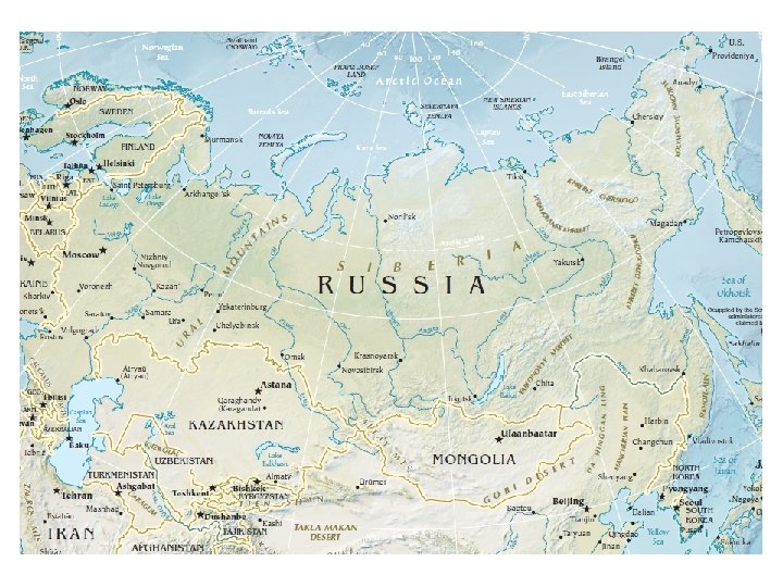 Central Siberian Plateau and Russian Far East • • • Uplands and mtns dominant High plateaus • 1 -2000 ft Far East • E of Lena R • Volcanic ranges • Kamchatka peninsula 120 volcanoes 20 active • Sakhalin, Kuril Islands Seized from Japan after WWII Japan still claims