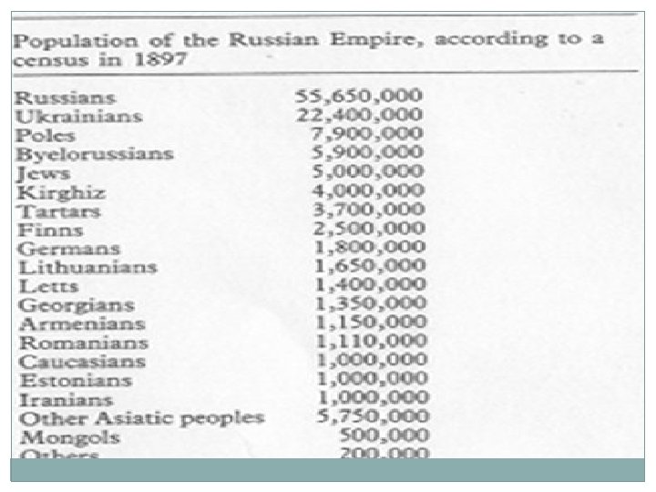Background - geography 1894 imperial Russia covered 8 million square miles (two and a half times the size of the US today) Covered a large part of two continents Most of the population was concentrated in European Russia It was this part that Russia’s major historical developments had occurred Moscow and St Petersburg (capital) were situated here Between 1815 and 1914 the population quadrupled from 40 million to 165 million Contained a wide variety of people of different race, language, religion and culture.