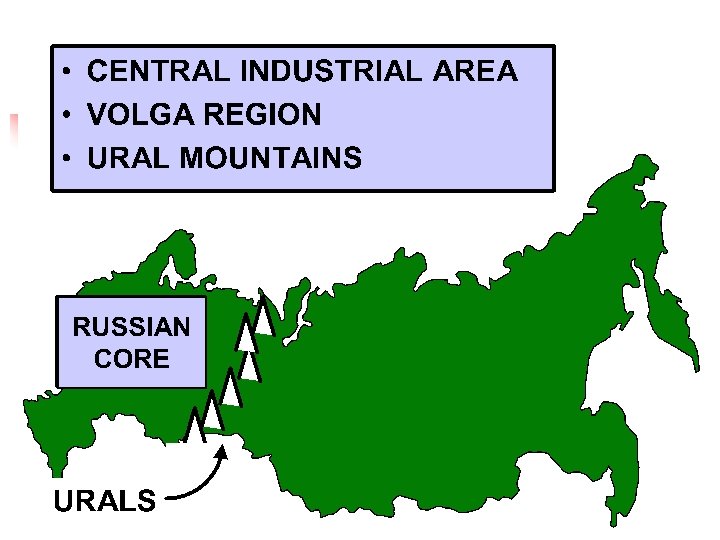 PHYSIOGRAPHIC REGIONS n RUSSIAN PLAIN n n n URAL MOUNTAINS n n n EASTWARD CONTINUATION OF NORTH EUROPEAN LOWLAND CORE AREA (MOSCOW BASIN) 2, 000 MILES LONG (NORTH-SOUTH) YIELD A VARIETY OF MINERALS WEST SIBERIAN PLAIN n n WORLD’S LARGEST UNBROKEN LOWLANDS PERMAFROST