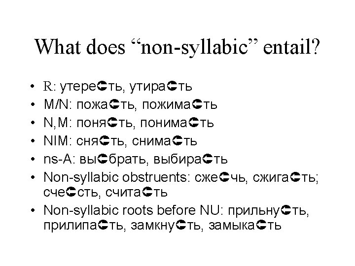 What does “non-syllabic” entail? • Name all the types of non-syllabic verbal stems that will insert an -i- when forming the derived imperfective. Give an example of each!