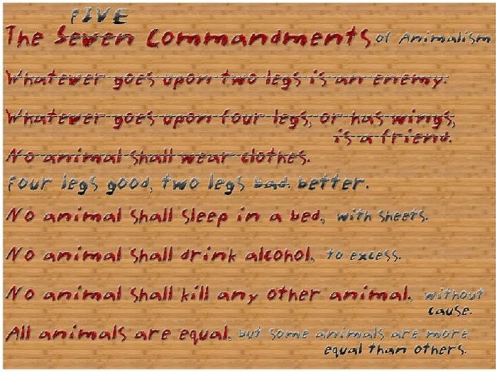 Great Purge Russian Rev. Animal Farm • Stalin feared the rise of opposing parties so he had many leaders killed or sent to Gulag • Over 4 million people were purged out of Russia ▫ Some were experts in industry, economics, and engineering, and some of the Soviet Union’s most talented writers and thinkers • When the hens refused to sell their eggs, they were considered rebels hand killed for their actions against animalism