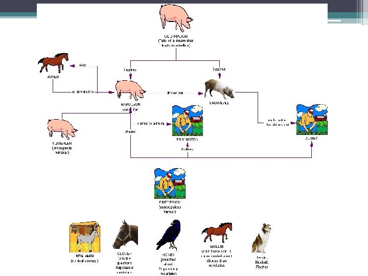 Communism Russian Rev. Animal Farm • a theory or system of social organization based on the holding of all property in common, actual ownership being ascribed to the community as a whole or to the state • Collective farms • All business was under the government • Animalism • Pigs eating the apples and milk while the other animals starved • Sleeping in beds • Dressing like humans • Trading with other farmers • Drinking alcohol