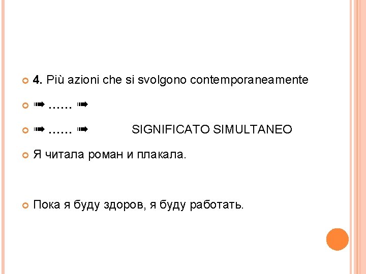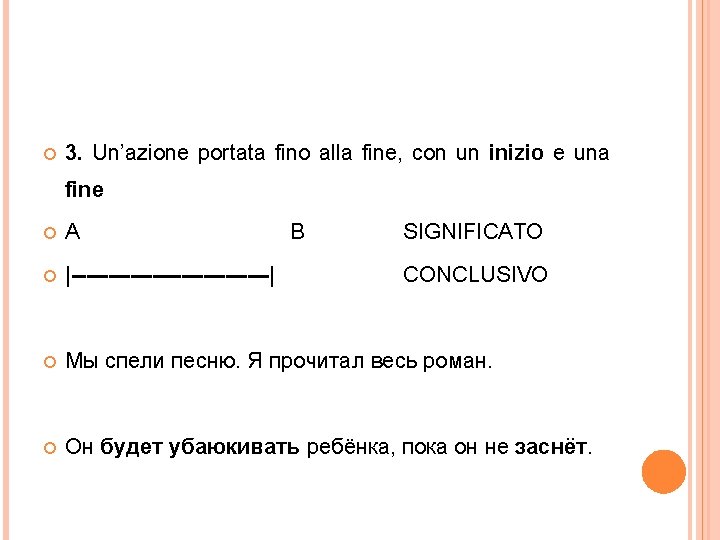 3. Un’azione abituale, ripetuta in maniera limitata o illimitata ➠ …… ➠ … ➠SIGNIFICATO RIPETITIVO E ABITUALE Антон часто покупал цветы Марине. Я читаю газету Утро каждый день.