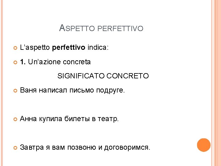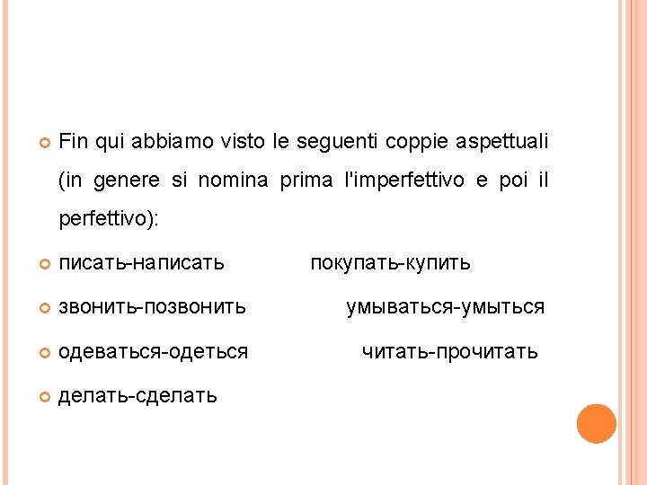 In russo si distinguono due aspetti, IMPERFETTIVO e PERFETTIVO. Quasi tutti i verbi russi si presentano sotto forma di coppia aspettuale, ossia sono formati DA DUE VERBI DI FORMA SIMILE, spesso derivati l’uno dall’altro.