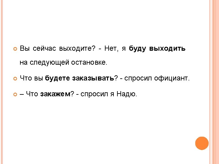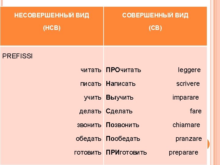 ➔ Chi ha scritto il romanzo “Noi”? - Evgenij Zamjatin (писать – написать) ➔ La ragazza mi ha spiegato molto bene la strada per il teatro (объяснять – объяснить) ➔ Cos’hai comprato al mercato? Ho comprato verdura e frutta.