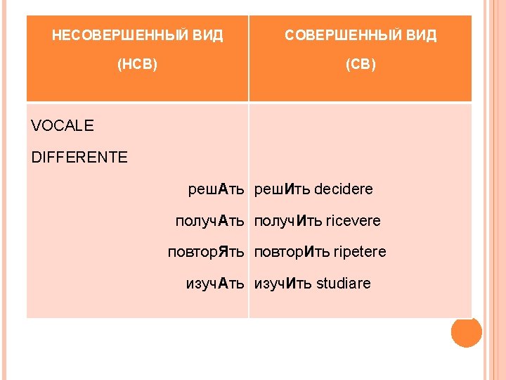 I verbi perfettivi e imperfettivi si formano con una VOCALE DIFFERENTE: Решать/решить (decidere, risolvere) изучать/изучить (studiare) умирать/умереть (morire) выбирать/выбрать (scegliere)