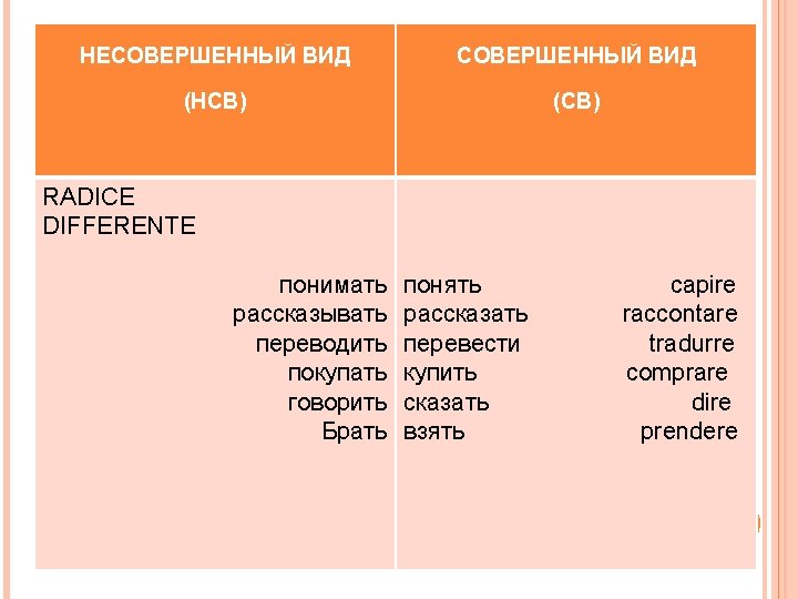 I verbi perfettivi e imperfettivi si formano con una RADICE DIFFERENTE: Говорить/сказать (dire) искать/найти (cercare/trovare) ложиться/лечь (coricarsi)