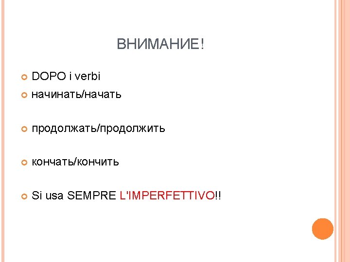 I verbi che esprimono l'INIZIO, la DURATA e la CONCLUSIONE di un'azione o verbi aspettuali vogliono sempre dopo di sé l'ASPETTO IMPERFETTIVO: cominciare, mettersi a: начинать/ начать, стать continuare продолжать/продолжить finire, smettere кончать/кончить, перестать
