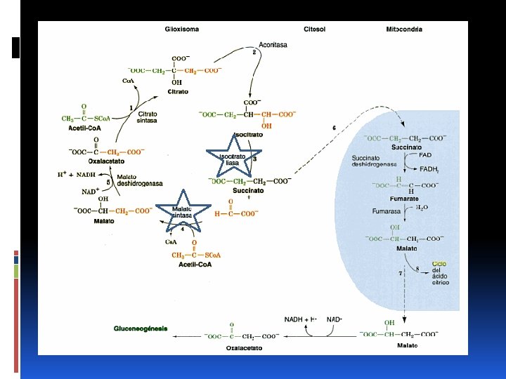 Pasos del Ciclo Glioxilato 1. Empieza con la condensación de acetil-coa y oxalacetato con enzima citrato sintetasa para formar citrato. 2. Se isomeriza a con enzima aconilasa isocitrato 3. La enzima isocitratoliasa la rompe en succinato y glioxilato 4. Se regenera oxalacetato del glioxilato a. Acetil-coa se condensa con glioxilato con la enzima malato sintetesa y forman malato b. Malato se oxida en oxalacetato en ciclo de ácido cítrico