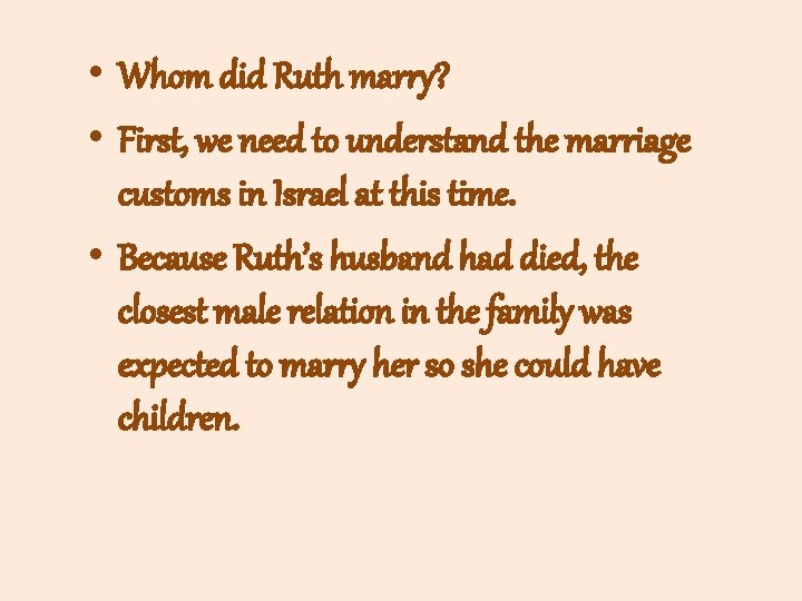 • Whom did Ruth marry? • First, we need to understand the marriage customs in Israel at this time. • Because Ruth’s husband had died, the closest male relation in the family was expected to marry her so she could have children.