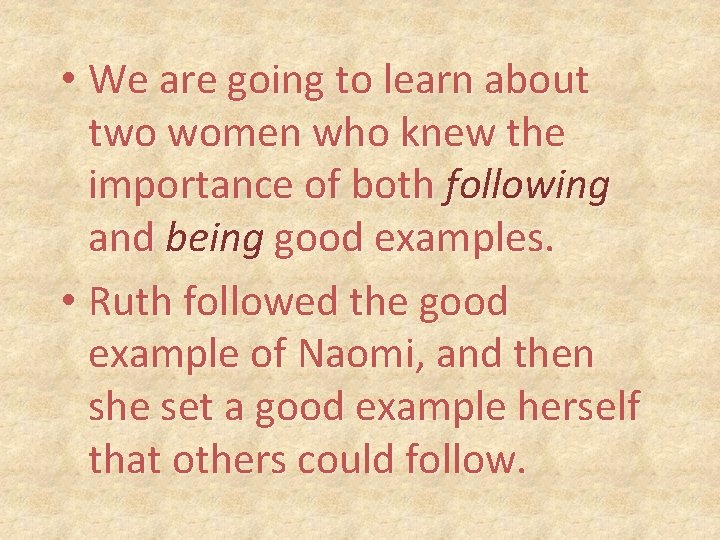 • We are going to learn about two women who knew the importance of both following and being good examples. • Ruth followed the good example of Naomi, and then she set a good example herself that others could follow.
