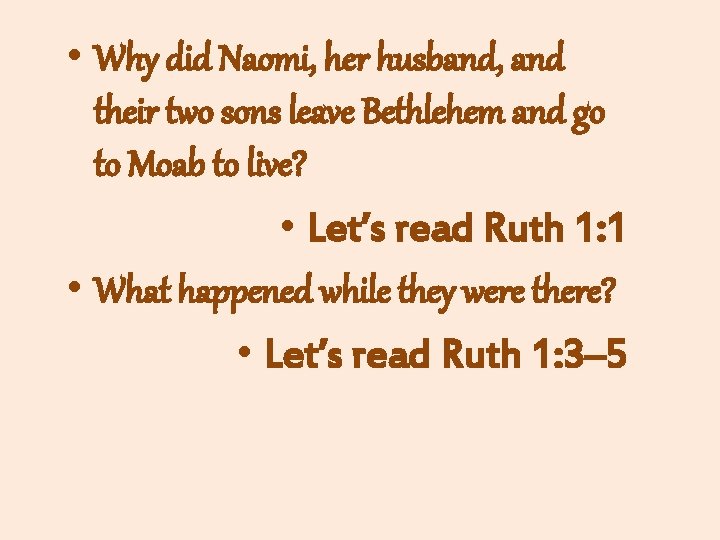 • Why did Naomi, her husband, and their two sons leave Bethlehem and go to Moab to live? • Let’s read Ruth 1: 1 • What happened while they were there? • Let’s read Ruth 1: 3– 5