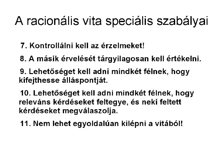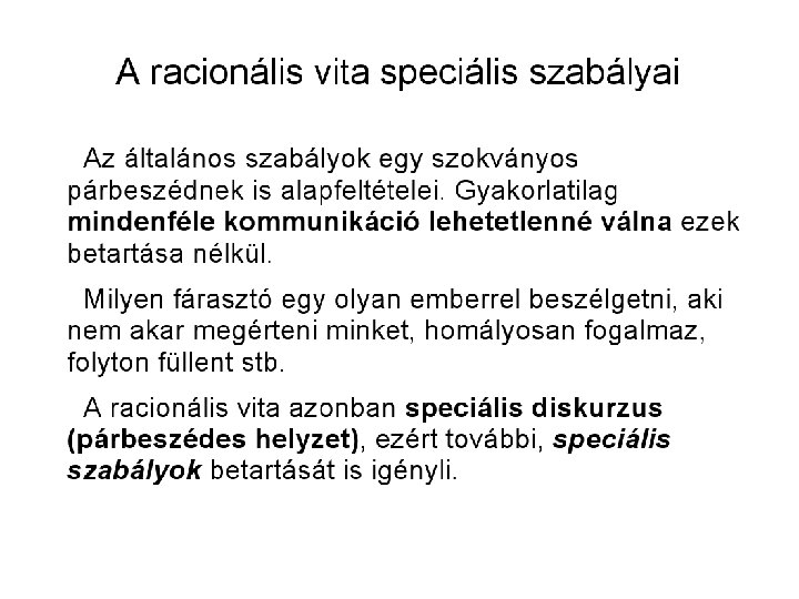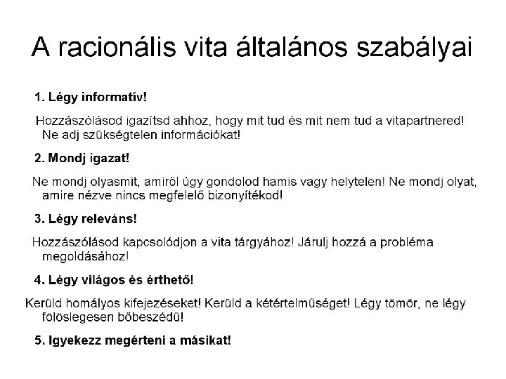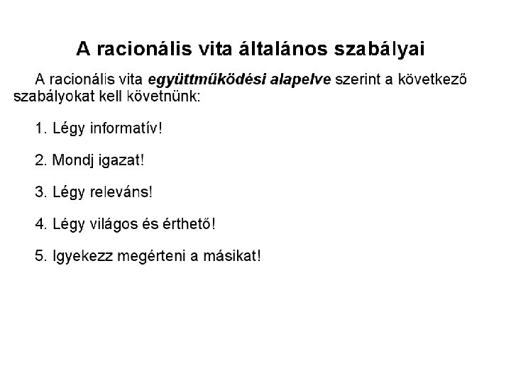 A racionális vita célja és eszközei 3. A racionális vita, mint egy közös célra irányuló diskurzus, bizonyos együttműködési szabályok betartását is előfeltételezi. Összefoglalva: A racionális vita teljesülése tehát egyrészt helyes következtetés alkalmazását, a témakör bizonyos szintű ismeretét és az együttműködési szabályok betartását igényli.