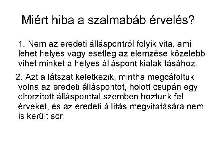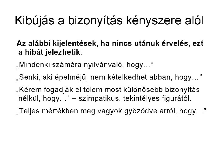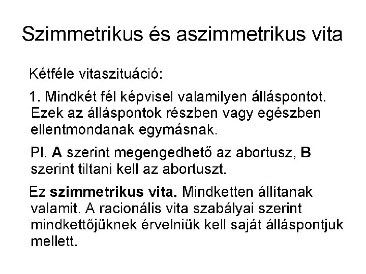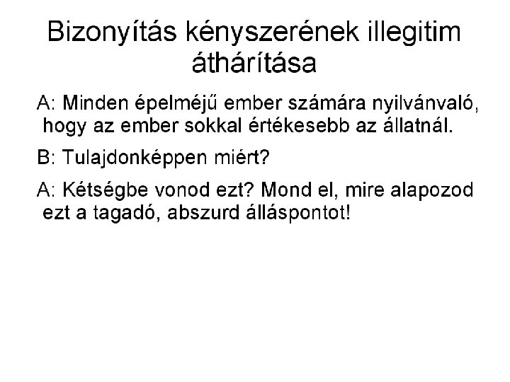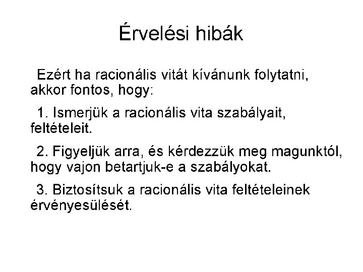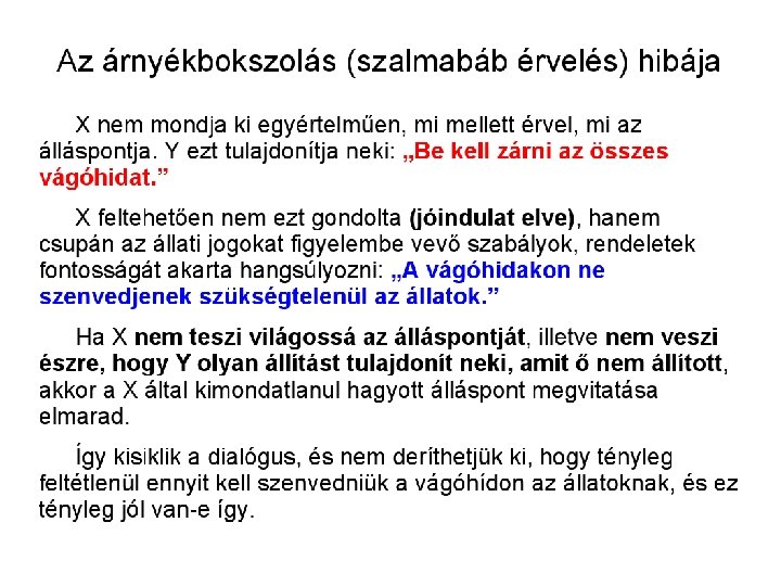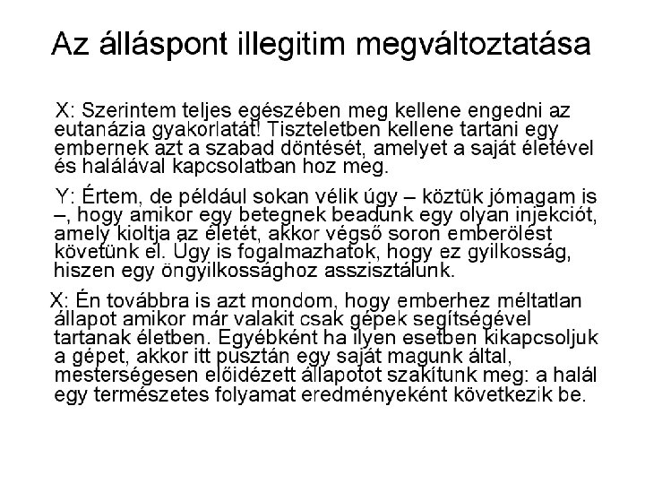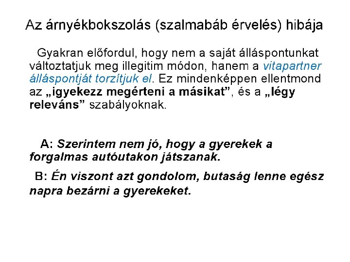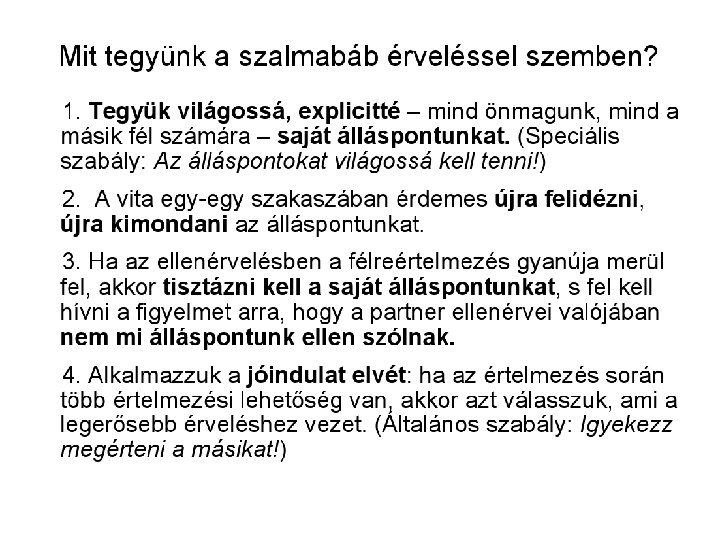 A jóindulat elve • Ha többféleképpen is lehet értelmezni egy érvelést, akkor azt az értelmezést kell választanom, amely a legerősebb, legjobb érveléshez vezet. Ezáltal elkerüljük, hogy érvelési hibát, irracionalitást tulajdonítsunk a másiknak. Világos tehát, hogy a jóindulat elve mintegy az ellenkezője a szalmabáb érvelésnek. • Minden érvelést úgy kell értelmeznem, úgy kell rekonstruálnom, hogy a lehető legerősebb érvelést kapjam. • Azután az így kapott érvelést kíméletlen, de korrekt kritikának vetjük alá, amelyben kiderül, hogy jól sikerült-e alátámasztani a kifejtett álláspontot vagy sem, hogy érdemes-e elfogadni azt. • Jóindulatúnak kell tehát lenni az értelmezésben, és szigorúnak (de nem méltánytalannak!) a kritikában - és nem fordítva!