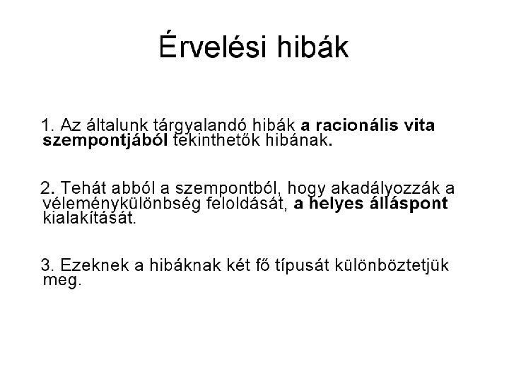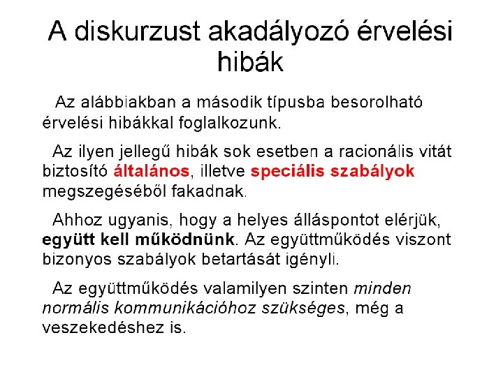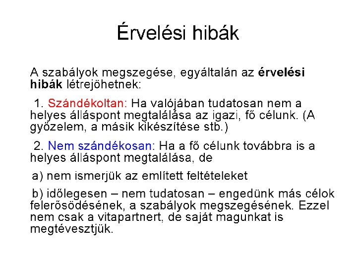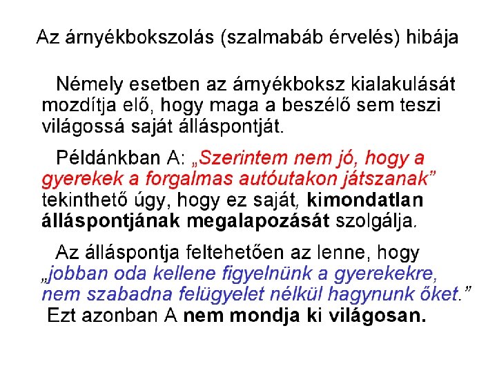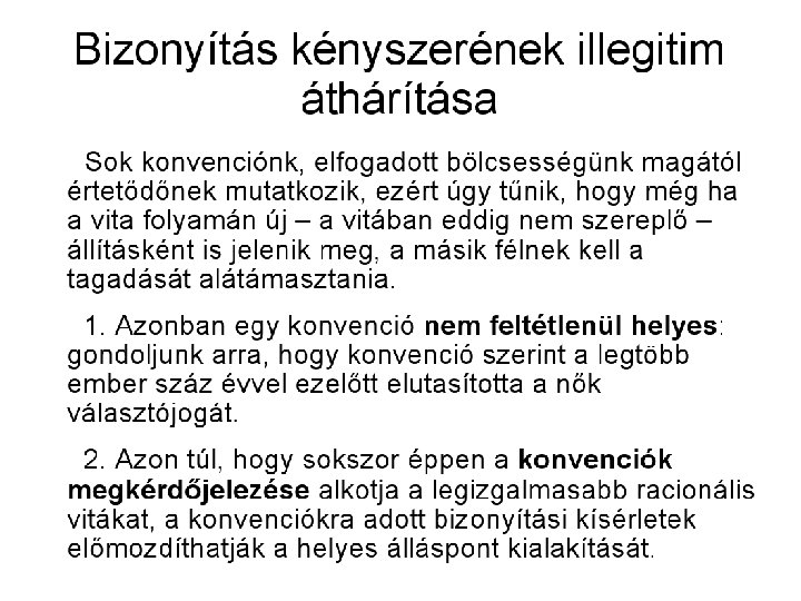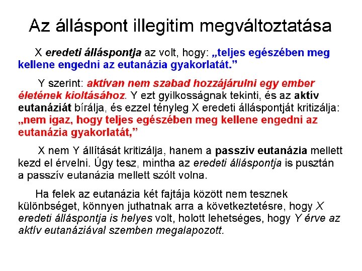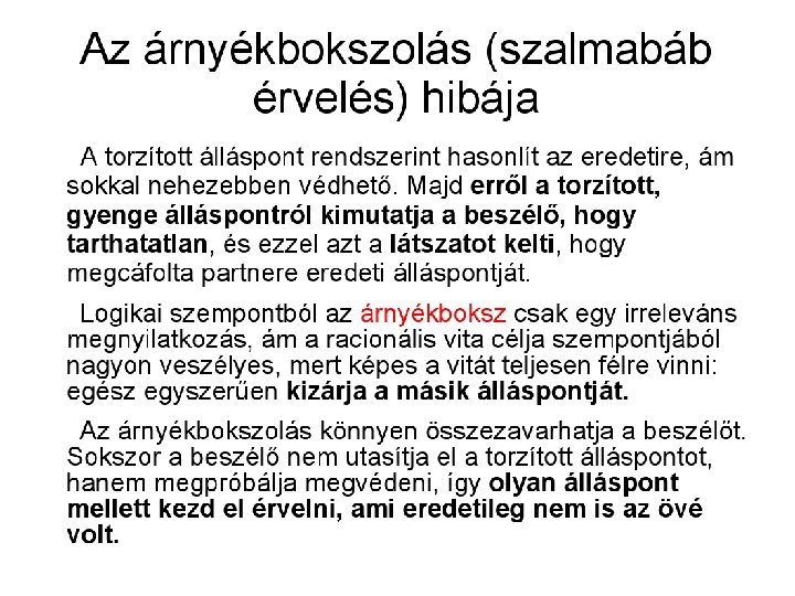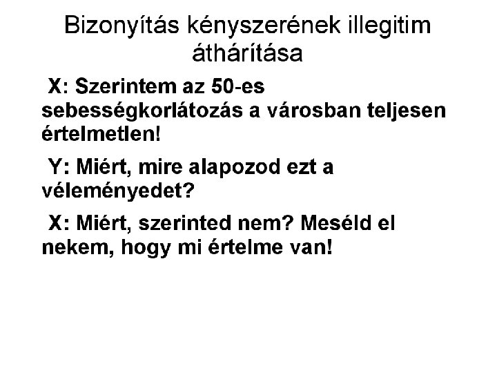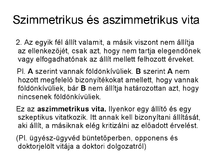 A jóindulat elve • Ha többféleképpen is lehet értelmezni egy érvelést, akkor azt az értelmezést kell választanom, amely a legerősebb, legjobb érveléshez vezet. Ezáltal elkerüljük, hogy érvelési hibát, irracionalitást tulajdonítsunk a másiknak. Világos tehát, hogy a jóindulat elve mintegy az ellenkezője a szalmabáb érvelésnek. • Minden érvelést úgy kell értelmeznem, úgy kell rekonstruálnom, hogy a lehető legerősebb érvelést kapjam. • Azután az így kapott érvelést kíméletlen, de korrekt kritikának vetjük alá, amelyben kiderül, hogy jól sikerült-e alátámasztani a kifejtett álláspontot vagy sem, hogy érdemes-e elfogadni azt. • Jóindulatúnak kell tehát lenni az értelmezésben, és szigorúnak (de nem méltánytalannak!) a kritikában - és nem fordítva!