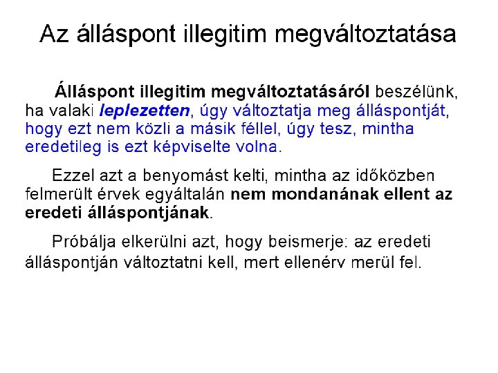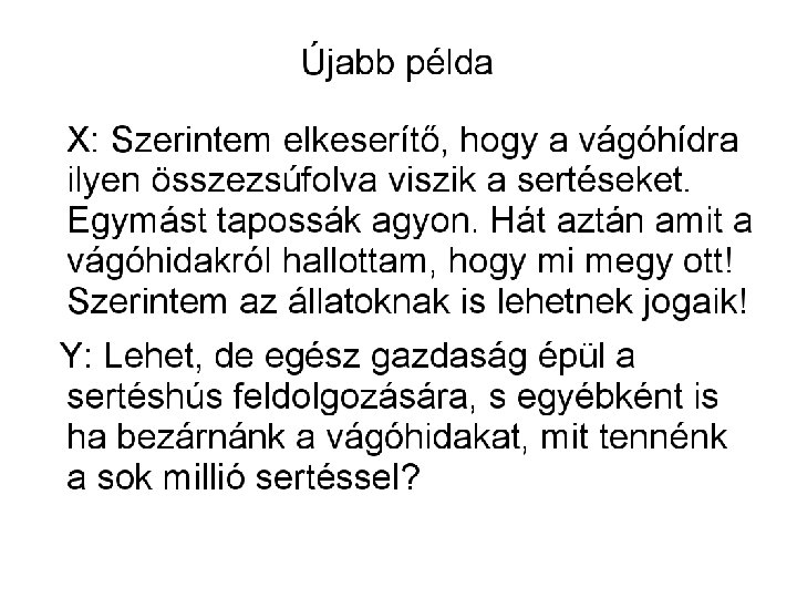 Példa A vezetői értekezleten X kolléga így szól a társához: X: Semmi értelme az értekezleteknek! A munkából veszik el az időt! Utána pedig azt kérik rajtunk számon, amit éppen az értekezletek miatt nem csináltunk meg. Y: Nézd, ha nem beszélnénk, nem tudnánk összehangolni és megszervezni a munkánkat, és így az a munka is értelmetlen lenne, ami az értekezletek helyett csinálnánk. X: De nem kellene alacsonyabb szintre tartozó részletkérdésekre pazarolni az időt!