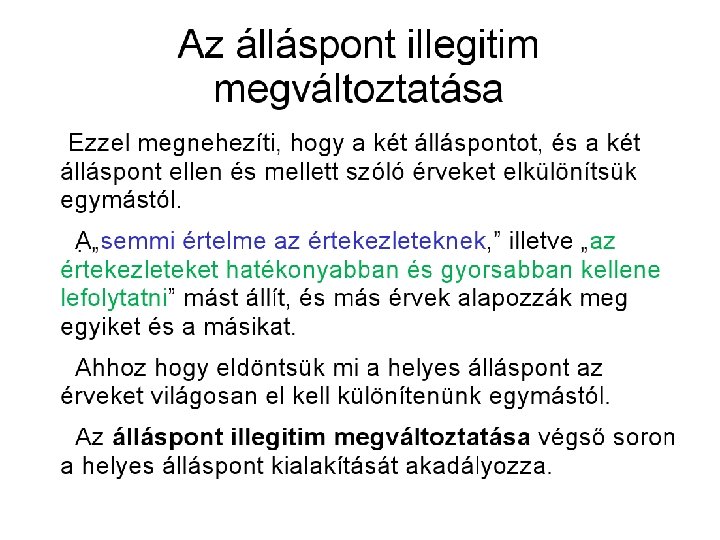 Miért van szükség a jóindulat elvére? • 1. A szigorúbb (gyengébb érveléshez vezető) értelmezés elleni érveink nem biztos, hogy jók az erős érveléshez vezető, jóindulatú értelmezés esetén. • Magunkat is becsapjuk, ha azt hisszük, könnyedén megcáfoltunk egy, gyengének rekonstruált érvelést, miközben lehet, hogy az érvelés erős volt, csak mi félreértettük. • 2. Vitaszituációban: Ha nem jóindulatúan értelmezünk, a vitapartner „eltáncolhat” ellenérveink elől arra hivatkozva, hogy az érvelését a jóindulatú értelmezés szerint kell érteni. • Ez fölösleges, újabb vitát szülhet, és eltérítheti a vitát az eredeti céljától.