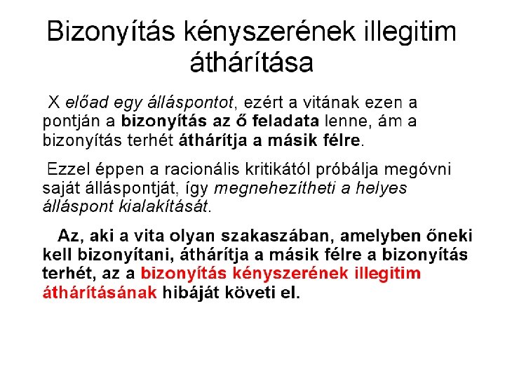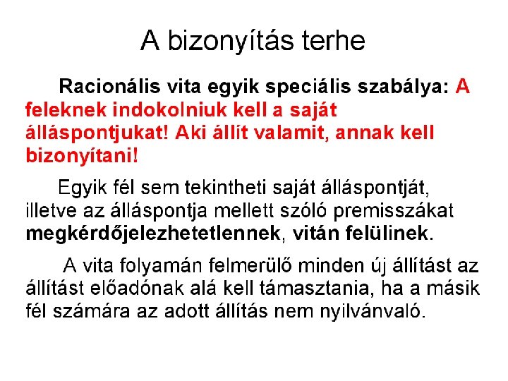 Externális kritika és a bizonyítás terhe Externális kritika alkalmazásakor új információt, új állítást viszünk a vitába, így a bizonyítás terhe ránk hárul. Következésképpen, akár szimmetrikus, akár aszimmetrikus vitát folytatunk, az externális kritikát alkalmazót terheli a bizonyítás kényszere. Gyakori hiba a hétköznapi vitákban, hogy az újabb információt alkalmazó fél kibújik a bizonyítás terhe alól, többnyire úgy, hogy a vitapartnerére hárítja azt.