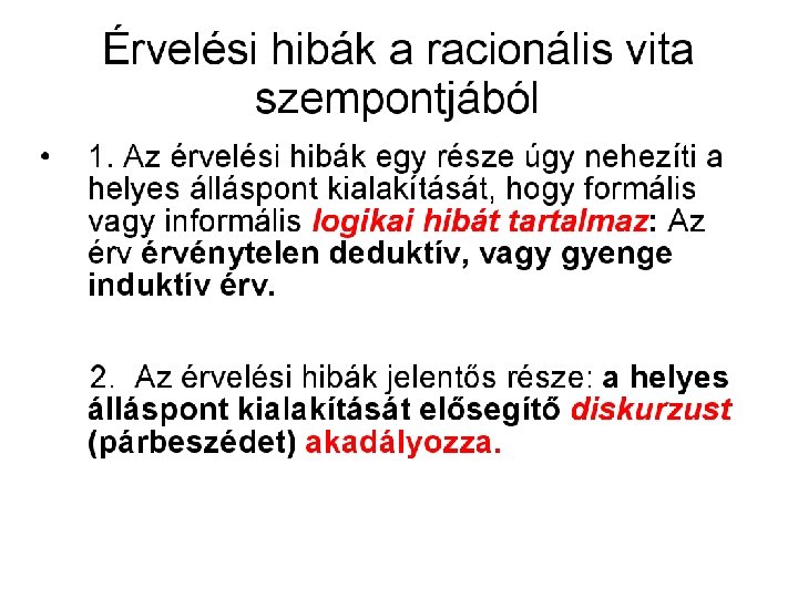 A racionális vita célja és eszközei 2. A helyes következtetés alkalmazása szükséges, de nem elégséges feltétele a jó érveknek, illetve a racionális vitának. Ugyanis logikai értelemben helyes következtetés hamis téziseken is alapulhat. Pl. P 1: Minden magyar adócsaló. P 2: Gábor magyar. K: Gábor tehát adócsaló. A következtetés logikai szempontból korrekt, ám feltételezhető, hogy az egyik kiinduló tézise („Minden magyar adócsaló. ”) hamis. Ezért a végkövetkeztetés igazsága („Gábor adócsaló. ”) nincs garantálva. Tehát a racionális vita teljesüléséhez a logika mellett az adott problémakör alapos ismeretére is szükségünk van.