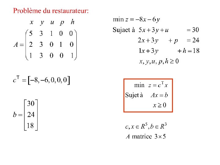 Problème du restaurateur transformé en min • Transformons les contraintes d’inégalité du problème du restaurateur en égalité avec les variables d’écart u, p et h: min z = – 8 x – 6 y Sujet à 5 x + 3 y ≤ 30 2 x + 3 y ≤ 24 1 x + 3 y ≤ 18 x, y ≥ 0 min z = – 8 x – 6 y Sujet à 5 x + 3 y + u =30 2 x + 3 y + p =24 1 x + 3 y + h = 18 x, y, u, p, h ≥ 0