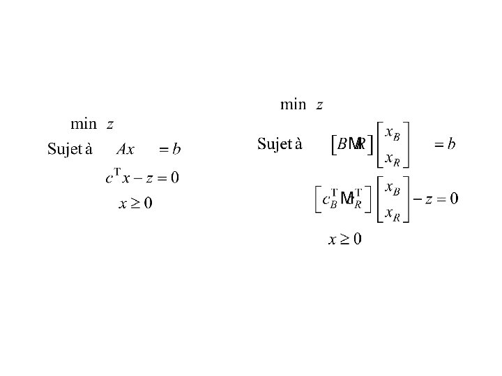 En remplaçant x. B par sa valeur en fonction de x. R dans l’équation de la fonction économique Notons que ces deux problèmes sont équivalents car le deuxième est obtenu du premier à l’aide d’opérations élémentaires utilisant une matrice non singulière B-1