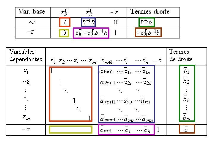 Les variables de x. B (dénotées jusqu’ici variables dépendantes) qui sont associées aux colonnes de la base B, sont dénotées variables de base Les variables de x. R (dénotées jusqu’ici variables indépendantes) sont dénotées variables hors base