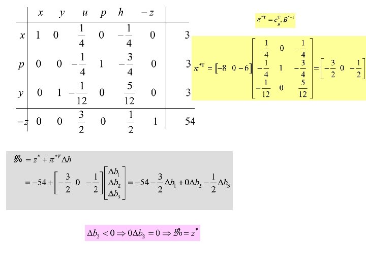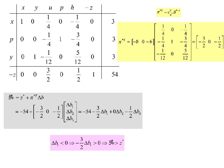 Résolution graphique • Considérons la fonction économique : z = – 8 x – 6 y. • La solution optimale: x = 3 et y = 5 => z = – 54. • Vecteur des multiplicateurs optimaux: πT = [ – 3/2, 0, – 1/2] • Si b 2 = 24 devient b 2+Δb 2 avec Δb 2<0 domaine réalisable ne change pas 5 x + 3 y ≤ 30 2 x + 3 y ≤ 24 1 x + 3 y ≤ 18