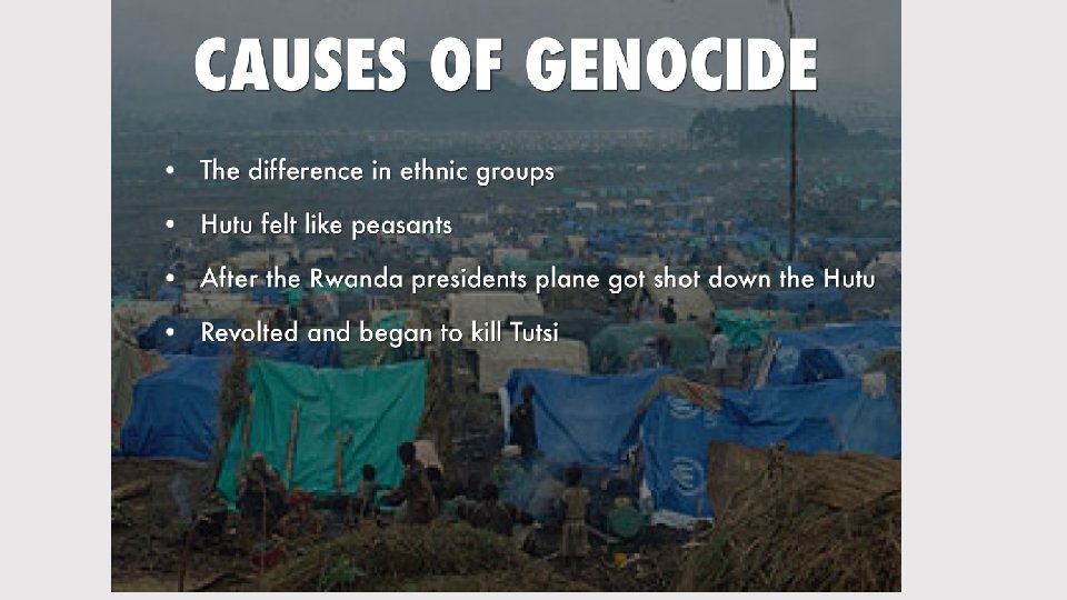 Cause of conflict • Causes of the conflict arose from the tensions between the religious groups called the Hutu and Tuitses. • it began When the extremist- led government of Hutus began a plan to eliminate the Tutsis after the presidents plane was shot down over Kigali on April 6 th 1994. • The Militia group known as the Interahamwe (“ those who attack together”) and Impuzamuganbi (“those who have the same goal”) set up road blocks and barricades and began to slaughter all Tutsis that entered the area.
