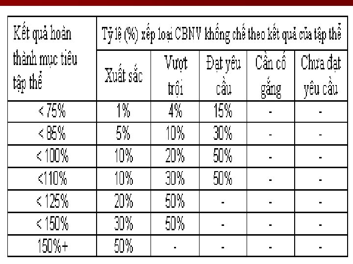Ma trận phân bổ mức thưởng Nhóm 6 Nhóm 5 Nhóm 4 Nhóm 3 Nhóm 2 Nhóm 1 1. 5 1. 4 1. 3 1. 2 1. 1 1 Xuất sắc 3 2. 8 2. 6 2. 4 2. 2 2 1. 69 1. 56 1. 43 1. 4 1. 3 1. 2 1. 1 1 0. 7 0. 65 0. 6 0. 55 0. 5 Vượt trội Đạt 1. 95 1. 82 1. 5 Cần cố gắng 0. 75