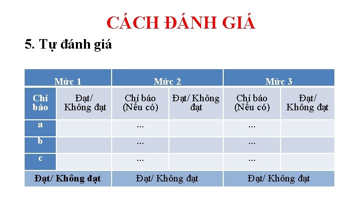 CÁCH ĐÁNH GIÁ 5. Tự đánh giá: Chỉ báo, tiêu chí được xác định đạt hoặc không đạt theo nguyên tắc: 1. Đánh giá quá trình 5 năm của chu kỳ (chủ yếu) Hoặc 2. Đánh giá tại thời điểm tự đánh giá.