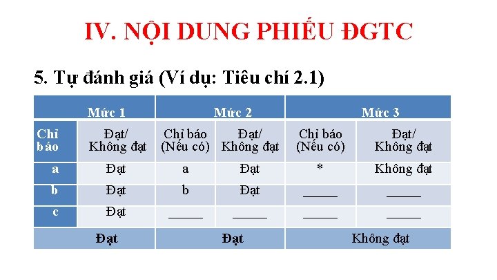 * LỰA CHỌN CẤU TRÚC VIẾT PHẦN MÔ TẢ HIỆN TRẠNG • Hình thức 2 (Phụ lục 5 b): Mô tả từng nội hàm theo từng chỉ báo của tiêu chí. Không viết tách theo từng mức. - Ưu điểm: Ngắn gọn. - Nhược điểm: Khó kiểm soát hết nội hàm; dễ nhầm lẫn cho người viết, người đọc; dễ nhầm khi tổng hợp đánh giá đạt/không đạt tại mục TĐG.