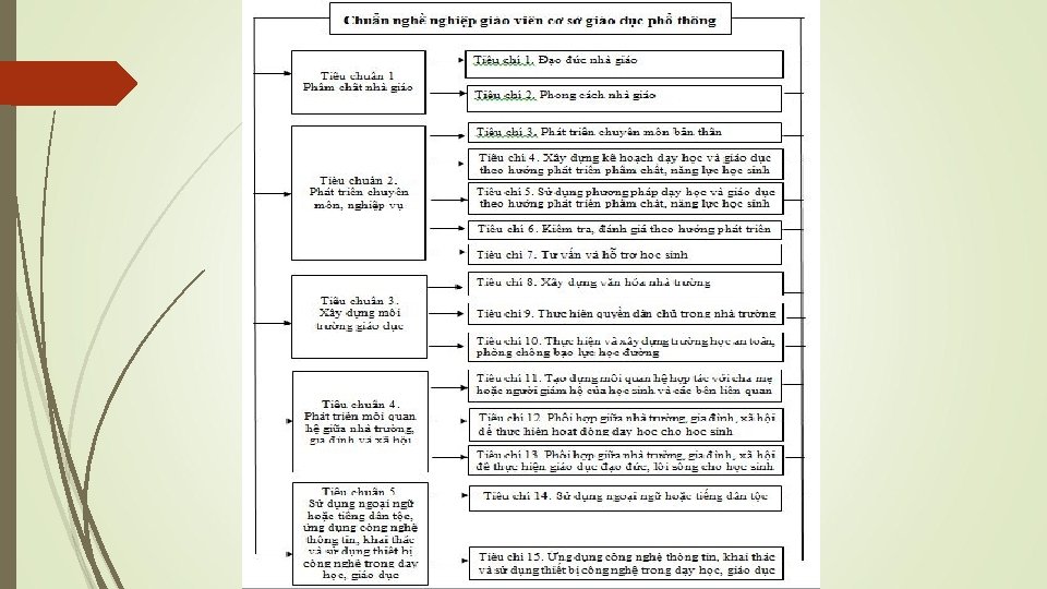 Phâ m châ t nhà giáo Sử dụng ngoại ngữ/ tiếng dân tộc, ứng dụng CNTT, khai thác và sử dụng thiết bị CN trong dạy học, giáo dục Phát triển mối quan hệ nhà trường, gia đình và xã hội Chân dung người GV Phát triển chuyên môn, nghiệp vụ Xây dựng môi trường giáo dục