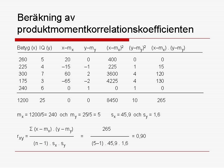 Finns det samband mellan betyg och intelligens? Betyg= summan av de 16 slutbetygen i åk 9. Intelligens= Binets IQ-test uttryckt i Staninepoäng (1– 9). Fem elever i åk 9 har värdena (260, 5), (225, 4), (300, 7), (175, 3) och (240, 6):