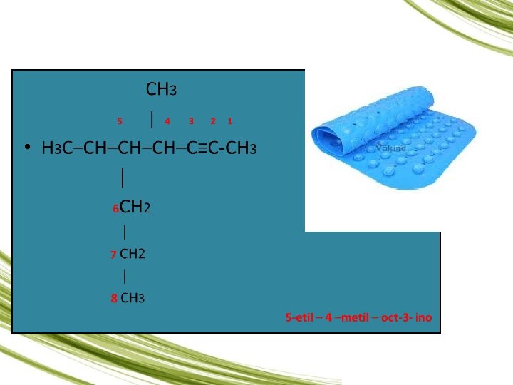 Alcinos – O Alcino mais simples é o etino (também chamado acetileno). Um exemplo de aplicação do acetileno é a produção do PVC (policloreto de vinila), etanol e ácido acético.