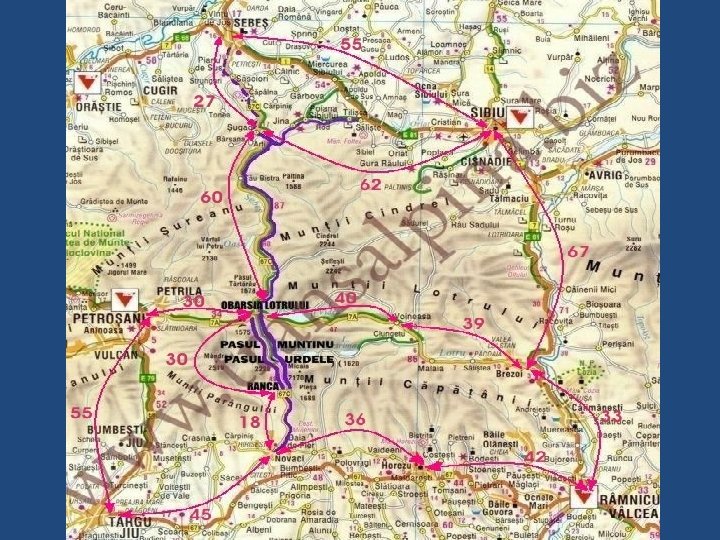 Linia violet reprezintă traseul original al Transalpinei, aşa cum a fost ea inaugurată de Regele Carol al -II-lea în 1938. Linia violet întreruptă reprezintă un traseu alternativ al Transalpinei, datorită faptului că pe porţiunea Jina - Sugag drumul este în lucru nefiind încă asfaltat. Deşi încă neasfaltată această porţiune nu pune probleme de traversare nici unei maşini pentru că drumul fost lărgit şi tasat iar acum se lucrează la terasare. Linia violet dublă dintre Obârşia Lotrului şi Rânca reprezinta zona cea mai frumoasă din Transalpina ADEVARATA TRANSALPINA.